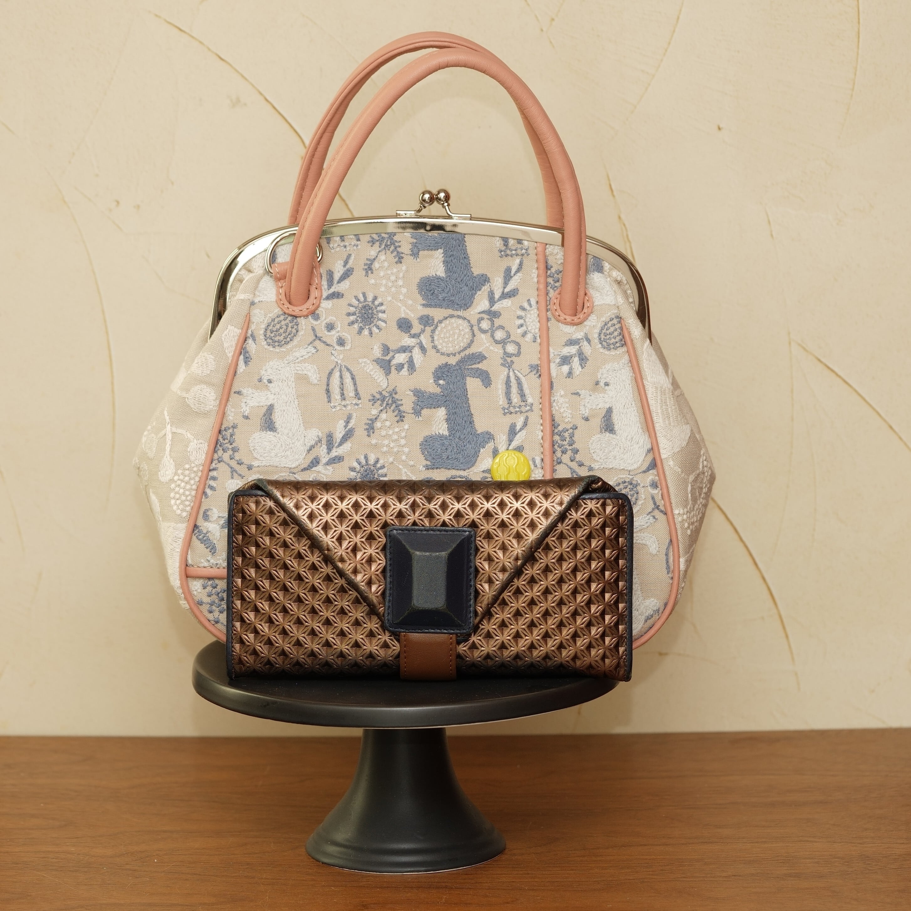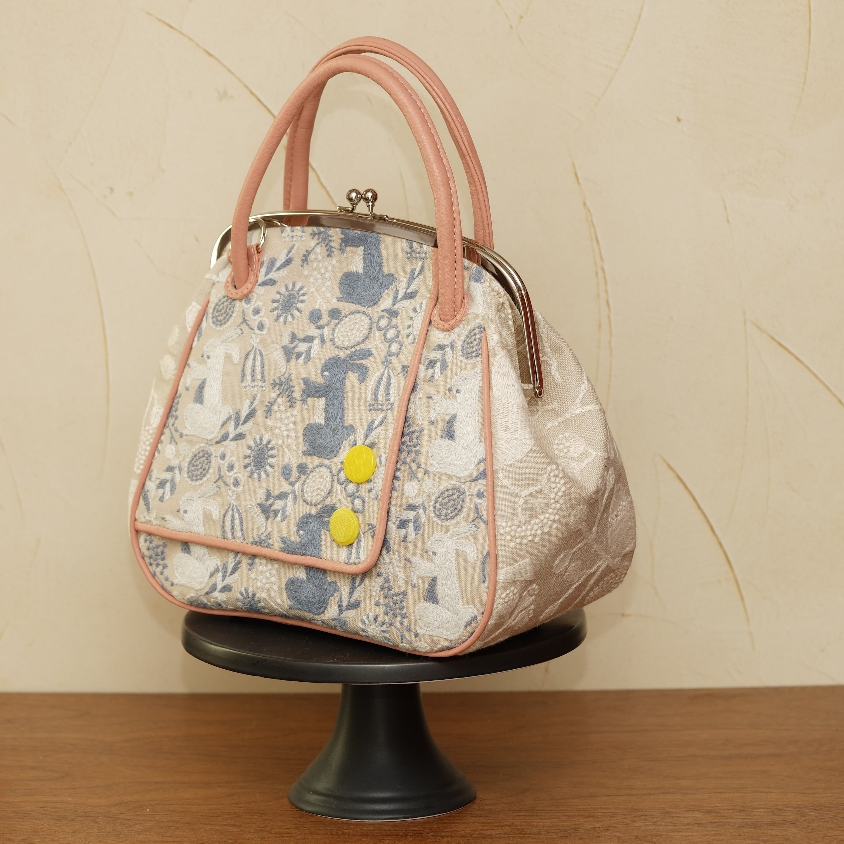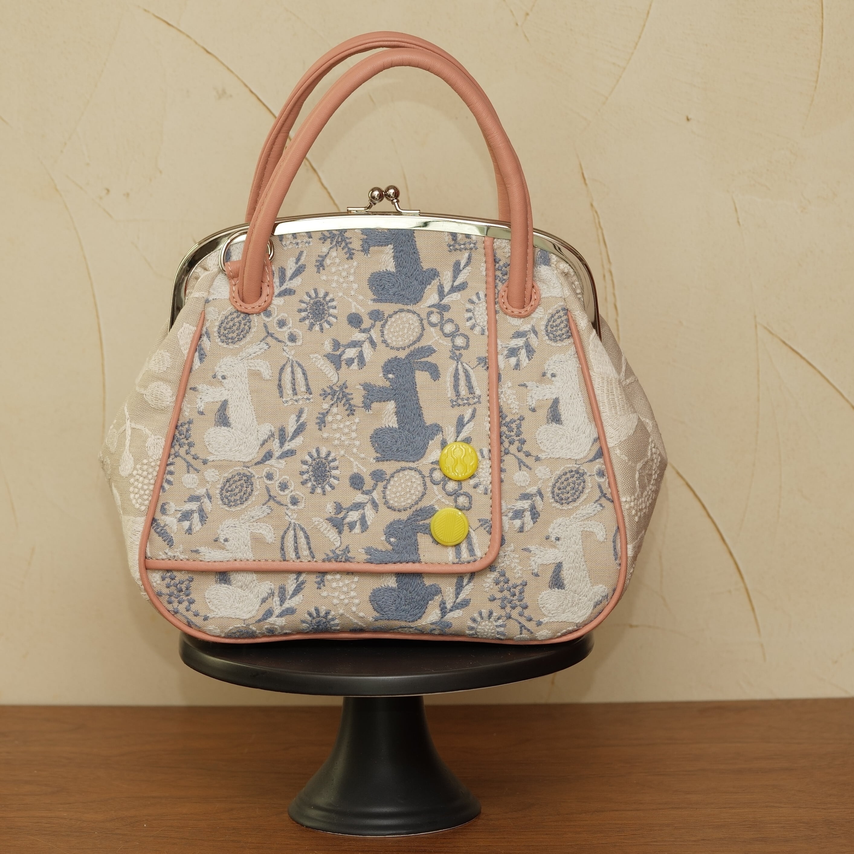 うさぎをテーマにしたこのがま口バッグは、点と線模様製作所様の素敵なテキスタイルを使用しており、洋服をモチーフにした際立つデザインが特徴です。遊び心とスタイリッシュさを兼ね備えたこのバッグは、デイリーコーディネートに華を添えるアクセントになります!