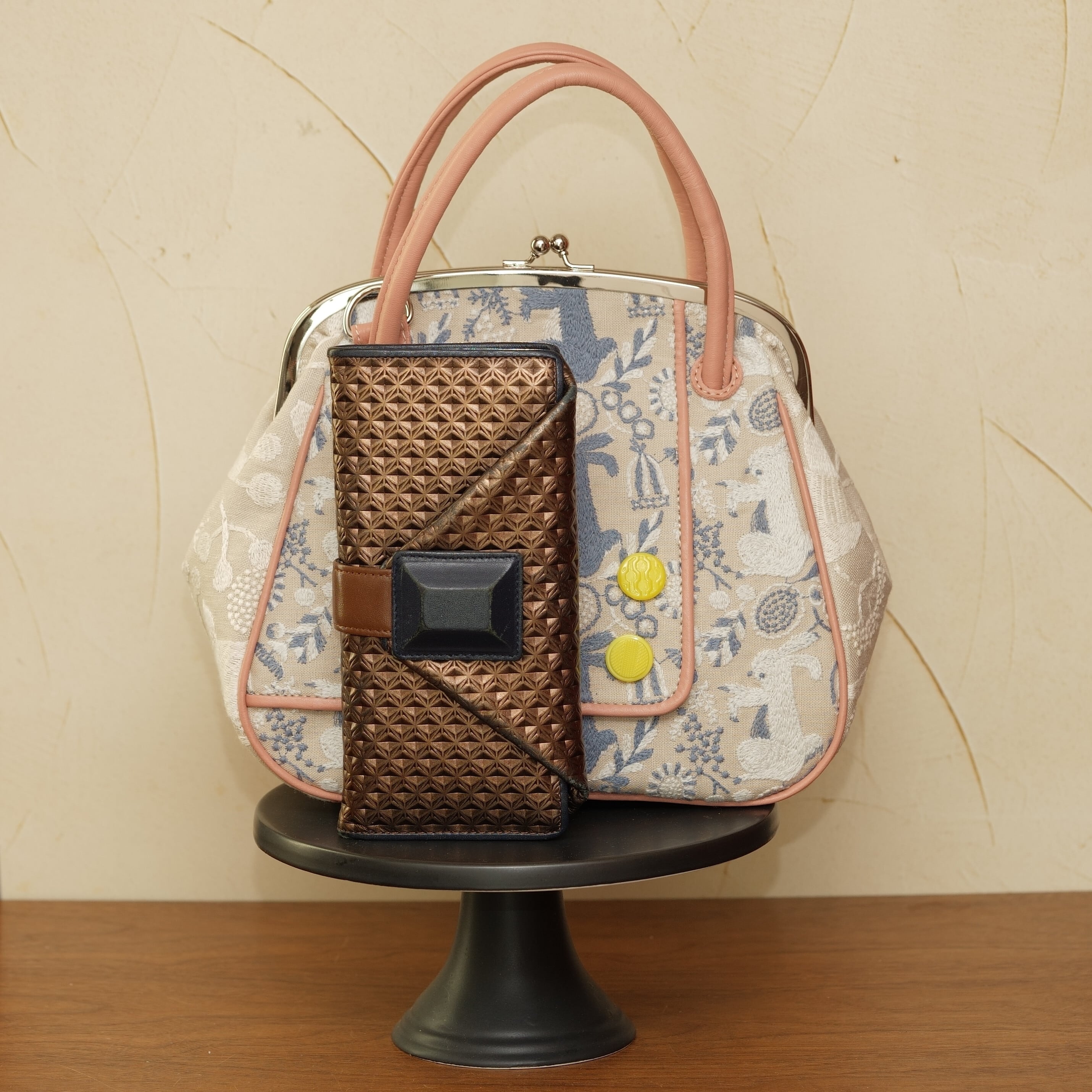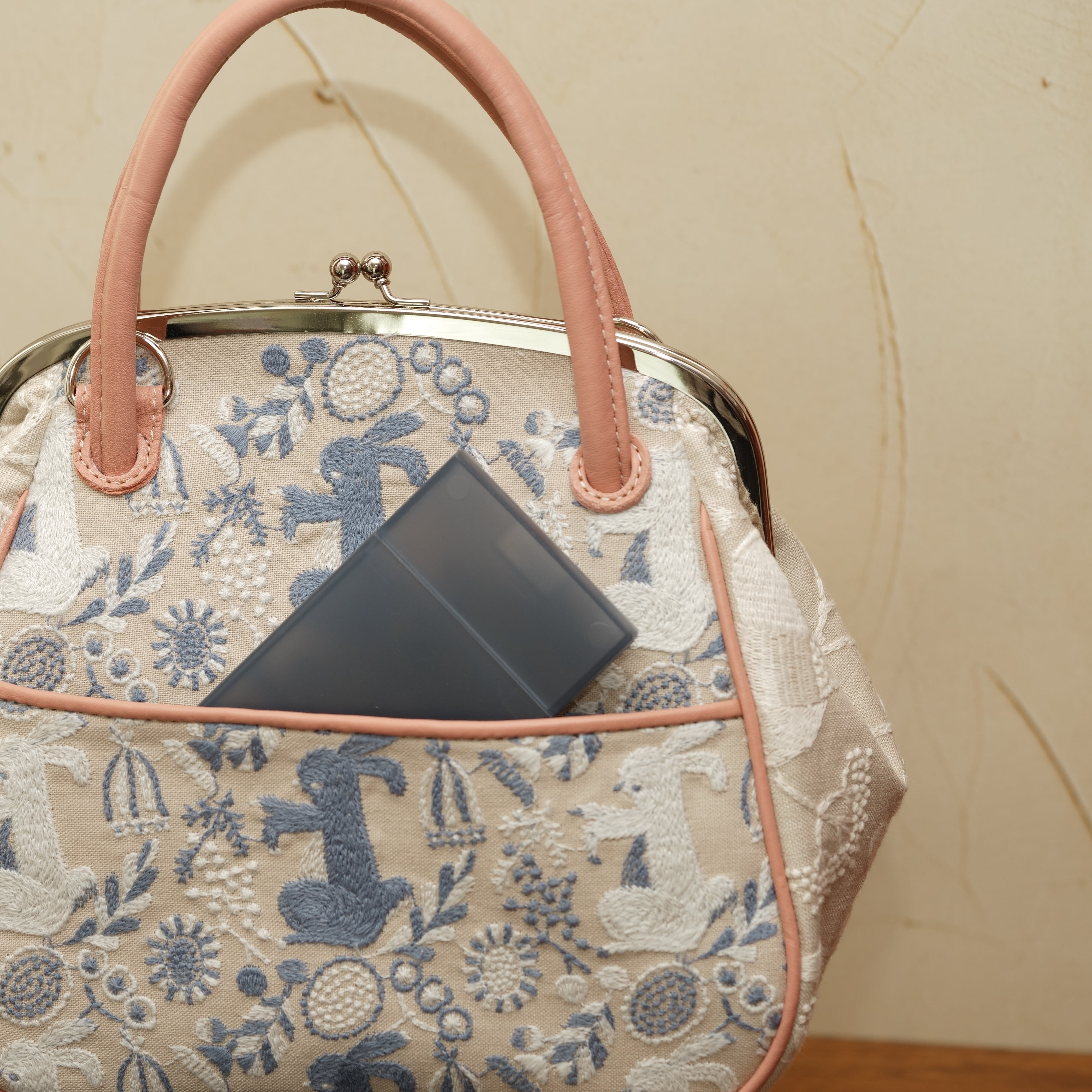 素材:皮革(くすみピンク)布(点と線模様製作所)ゴブラン生地 裏地:白い花 金具:シルバー(ニッケル)